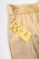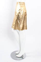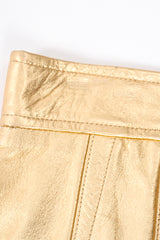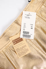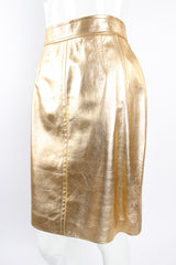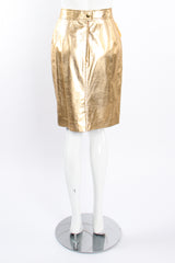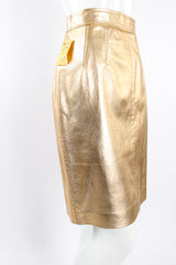 Gold leather lamé skirt by Escada lights up any holiday look. Soft metallic leather catches all the light with an allover glow in a classic pencil silhouette. Fully lined with flat-felled seams and back zipper with double snap closure. We would pair with a printed silk blouse, wool blazer, and point ankle boots for an unexpected take on suiting, but would work just as well with a tee and sneakers. Gold.