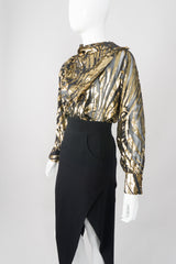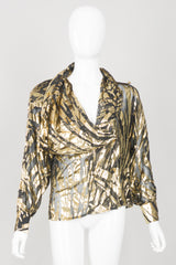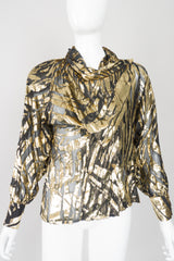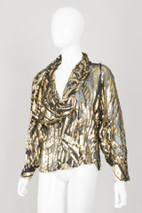 Sheer gold lamé silk velvet burnout top in a graphic striped palm frond pattern. Double-breasted sheer shirt-jacket with strong shoulders and a convertible collar. Neckline can be buttoned to form a draped handkerchief collar, or left open for a dramatic lapel. This blouse is missing its labels, we believe it to be by Alan Austin. We would wear over a black bra with a skinny leather pant for the modern power suit. Gold, black.