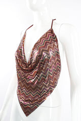 Wavy chevron striped metal mesh halter top by Whiting & Davis. Glamorous signature brass metal mesh tiles drape fluidly over the body in a handkerchief-style halter top in a fun fuchsia chevron stripe. Cowl neck and draped front with pointed hem and leather neck and back ties with felt-faced binding. We would wear with a skinny leather pant and oversized gold chandelier drop earrings, ready to celebrate life outside. Gold, fuchsia, cherry, rust, black.
