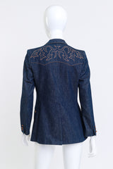 Larry Mahan, a legendary rodeo cowboy, designed his own western wear fashion including this embroidered denim blazer adorned with leather horse head buttons.