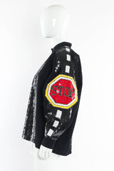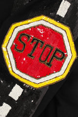 Sequin appliqué jacket by Modi featuring traffic sign prints.