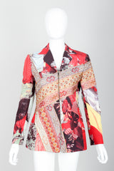 Bold printed zip jacket with tapestry patchwork by Moschino. Colorful mixed-media sateen jacket is a work of art, blending a crowded marketplace street scene print with a collage of embroidered ribbon-like tapestry patchwork. Sleek zippered jacket hugs the curves with contoured waist seaming and an elongated silhouette. Fully lined with notch collar. We would wear with the sleeves pushed up, nonchalantly layered over a wide leg linen pant and tee. Red, orange, yellow, gold, black, grey, powder blue, lilac, sage.