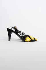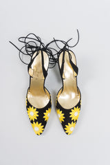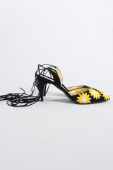 Embellished suede ankle wrap heels by Petra Firenze. Yellow daisy appliqués cheerfully cover the vamp of these tie-back pointed toe heels. Lightly padded footbed lined in metallic gold lamé leather. We would wear with a cropped boyfriend jean and eyelet blouse for a breezy summer look. Black, yellow, white, gold.