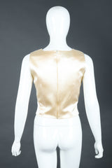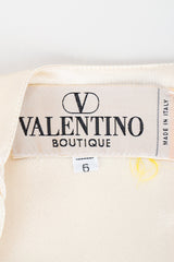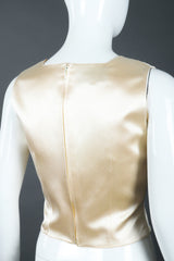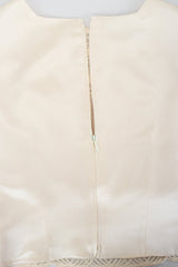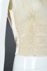 Embroidered square-bateau neck, sleeveless shell by Valentino. Intricate silk appliqué on sheer silk organza. Swirls and lines adorn the front and add texture against the smooth silk back. Back zipper with clasp closure. This classic silhouette is the perfect top to pair a white silk skirt for the minimalist bride. Cream.