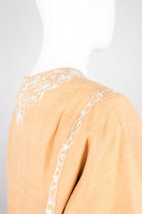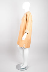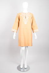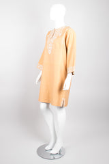 Embroidered silk tunic dress by Dehliwala. Shift tunic makes an effortless minidress. Notched neck with a hook-and-eye closure and back zipper. Embroidery at neck opening, sleeve cuffs, and side vents. We would wear with a jeweled sandal, giant statement earrings, and our hair piled messily atop our head, ready for every warm weather party. Apricot, white.
