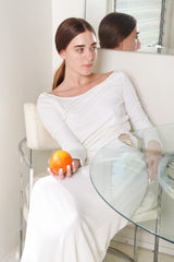 Iconic white jersey cutout gown by Tom Ford for Gucci from his 1996 white gown era. Highly collectable gown with gold hardware belt is a showstopper. Slinky jersey knit glides over the body in this lined minimal sheath silhouette. Pull-on style bateau-neck opening with long sleeves. Spaghetti waist belt with contoured gold hardware sits on the hips under the dress and is the pièce de résistance of this powerful look. We would keep the rest of the look sleek and channel our inner Kate Moss. Ivory, gold.